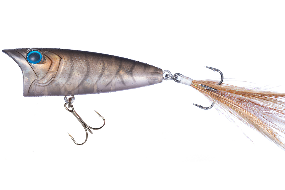 The “LOUDER50”The strong point of small popper is attracting high pressured bass with small size and imitating small bait or bug or shrimp or frog. Quiet landing sound is also effective. The “LOUDER 50” has weight in the small body to make intentional action and to catch water firmly. Floating posture is slightly vertical because it has high specific gravity. So it has castablity and stability on the water. And it does not move by line tension. The maximum feather and tinsel realized quiet landing sound and catch water firmly. So it can entice bass on the same spot. Not to mention castability is awesome. It has big cup and “Break Water” mechanism to realize attractive power beyond its size. So it realized popping sound and splash to create water column. In this way, small size popper genres that are narrow because of their small range, it will be a strength that brings more fish than ever by overcoming the limits of its performance.